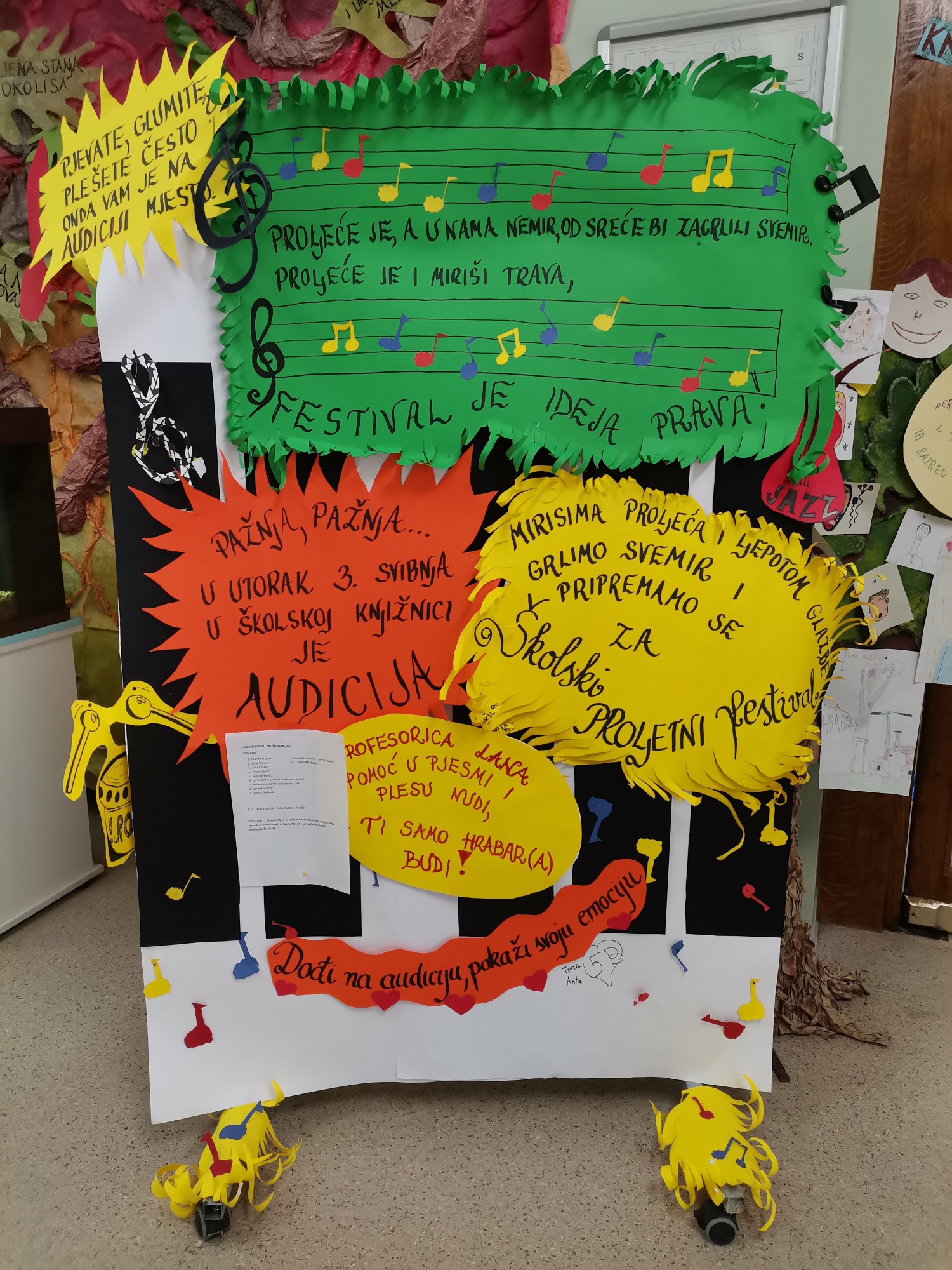 Ideja o festivalu osmišljena je i zabilježena u školskom Kurikulumu. Proljeće nas je potaknulo da na vrijeme krenemo s organizacijom školskog festivala. Na Projektni dan, 22. travnja, počele su pripreme s uređenjem prostora škole i dvorane. Naime 5. b, 5. d i 7.d razredi s učiteljicama L. Zagottom, L. Zlatar Pravica i T. Haber, osmislili su i napravili panoe, note i notovlje kojima su ukrasili školski prostor. Učiteljica glazbene kulture L. Zlatar Pravica i knjižničarka Lj. Radovečki, organizirale su 3. svibnja 2022. audiciju za sve učenike koji su imali želju nastupiti na školskom festivalu. Na audiciji je prošlo 11 učenika – pjevača i jedan plesni par koji je otplesao akrobatski rock&roll. Probe pjevača i voditeljica bile su česte i zahtjevne, ali istovremeno vesele i zabavne. Pripremili smo pozivnice za sve sudionike kako bismo naglasili važnost događaja za cijelu školu. Proljetni školski festival održan je 24. svibnja u 18 sati. Zanimljivo je spomenuti da smo u vrijeme festivala bili domaćini Erasmus gostima iz Poljske, Rumunjske, Italije, Grčke i Portugala pa su se neki od njihovih predstavnika također našli na pozornici. Učenici su u nastupu pokazali odvažnost, hrabrost i emocije. Bilo je to za sve lijepo i nezaboravno iskustvo. Festivalom smo završili aktivnosti vezane za ovu školsku godinu te dobili inspiraciju i poticaj te nove ideje. Fotografije svjedoče lijepom događaju.
